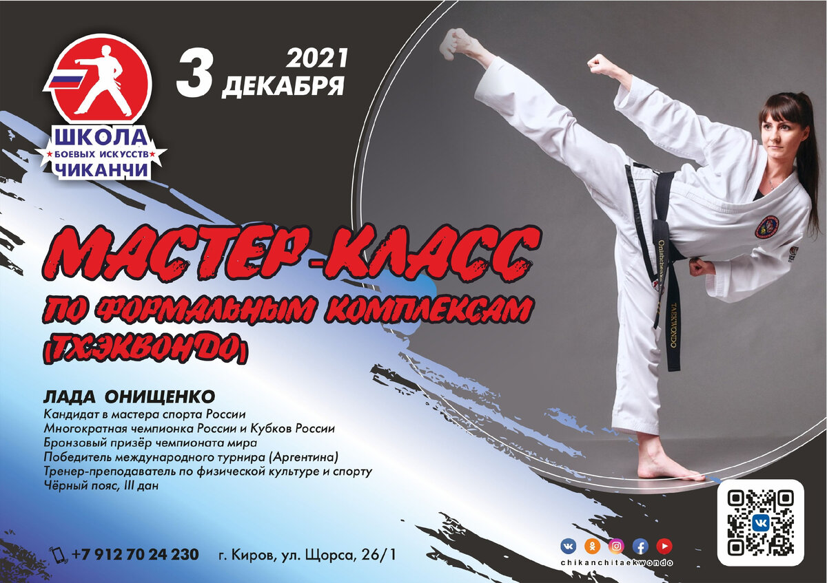 3 декабря в Кирове пройдет мастер-класс по формальным комплексам у тренера Школы боевых искусств Анатолия Чиканчи, бронзового призера чемпионата мира Лады Онищенко (черный пояс III дан). Для молодых спортсменов – детей от 6 лет и старше – это прекрасная возможность подтянуть свою технику перед предстоящими новогодними соревнованиями.