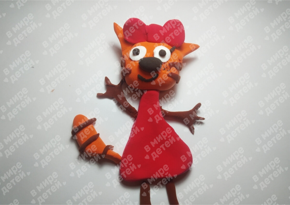 Предлагаем вам создать яркую и забавную поделку - озорную кошечку «Карамельку» из мультсериала «Три кота». Не забываете, пожалуйста, при смене кусочков мочить пальчики, чтобы пластилин от них отставал. И так приступим. Необходимые материалы: · нож для нарезки пластилина; · доска для нарезки; · лист картона; · пластилин белого, оранжевого, коричневого, красного и черного цветов; · вода; · салфетка. Этапы изготовления: Шаг 1 Нарезаем пластилин разными кусочками: оранжевый и красный побольше, остальные небольшие. Шаг 2 От оранжевого пластилина отделяем три не больших кусочка, из оставшегося катаем шарик. Это будет голова нашей шалуньи. Из двух не больших кусочков формируем ушки и хвостик. Шаг 3 Приделываем ушки к голове. Хвостик пока откладываем. Голову лепим на картон. Шаг 4 Красный кусочек так же делим на две не равные части. Из меньшей формируем бантик и приделываем его к голове Шаг 5 Из большого красного кусочка делаем платьице нашей Карамельке Шаг 6 Теперь очередь коричневого кусочка