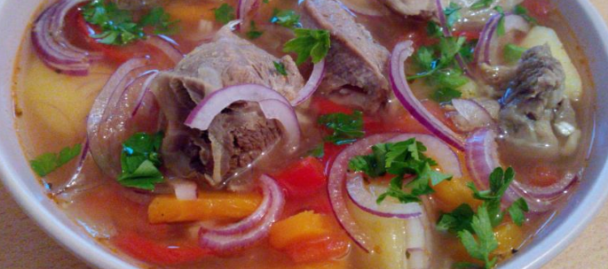 500г шейки баранины, 1 луковица, 1 красный перец, 2 морковки, 6 картофелин, 2 дольки чеснока, 10г кинзы, 10г укропа, 2 помидорки. В кастрюлю 6-7 литров нарезать лук и обжарить на растительном масле. Добавить кусочки мяса и обжарить, затем тушить в собственном соку. Морковь и перец нарезать соломкой и добавить в кастрюлю. Затем добавить крупно нарезанные помидоры, перемешать и залить всё горячей водой. Закрыть крышкой и дать закипеть на медленном огне. Когда мясо будет готово, добавить крупно нарезанный кубиками картофель. Долить воды до верха и подождать до закипания. После того, как картофель будет готов, добавить мелко нарезанный чеснок, соль, специи, зелень. Покипятить ещё 2-3 минуты. Приятного аппетита!