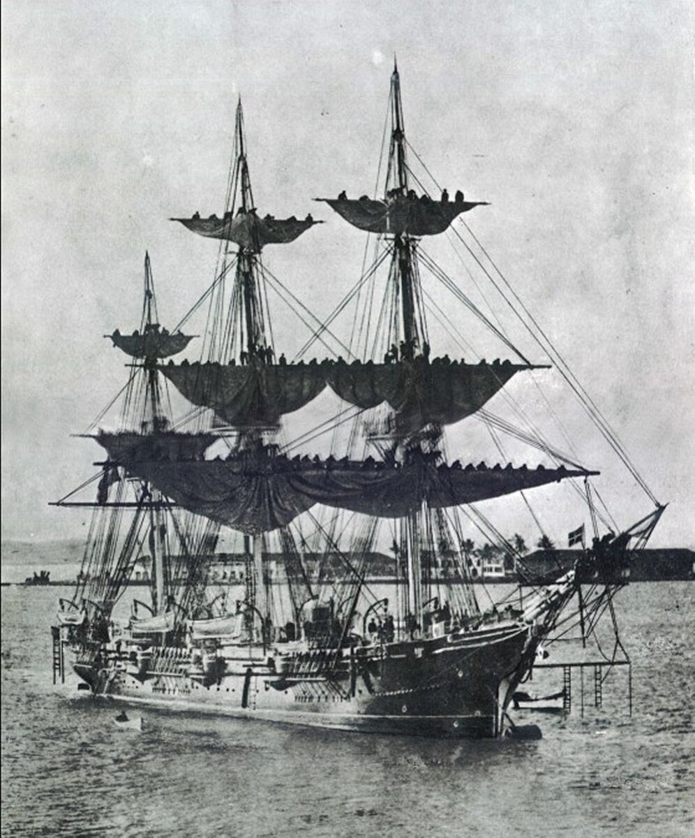 Двигатели- паровая машина 2200 л.с., паруса площадью 1625 м 2 . Скорость 12 узлов.