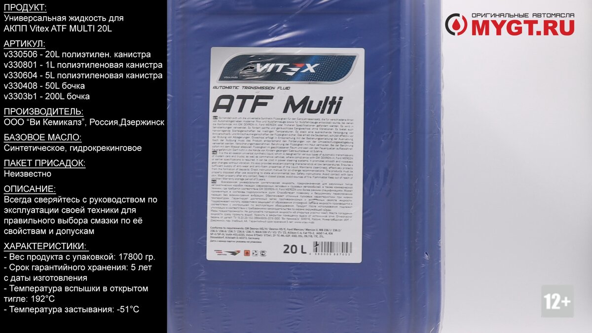 Продукт: Универсальная жидкость для АКПП Vitex ATF MULTI 20L Наш телефон: 8-800-550-57-22 ПН-ПТ 9.00-17.00 (МСК+4) Артикул: v330506 - 20L (полиэтиленовая канистра) v330801 - 1L (полиэтиленовая канистра) v330604 - 5L (полиэтиленовая канистра) v330408 - 50L (бочка) v3303b1 - 200L (бочка) Производитель: ООО “Ви Кемикалз” 606016, Россия, Нижегородская обл., г. Дзержинск, пер. Учебный, 4А. Базовое масло: Синтетическое, гидрокрекинговое. Пакет присадок: -------- Ссылка для покупки: https://mygt.ru/oil/VITEX/vitex-atf-multi-20-l.html Всесезонная универсальная синтетическая жидкость, предназначенная для различных типов автоматических коробок передач современных легковых и грузовых автомобилей, а также коммерческой техники, где требуется соответствие GM DEXRON-III, Ford MERCON или более ранним спецификациям. Может применяться в системах гидроусилителя руля. Способствует плавному и бесшумному переключению передач без возникновения вибрации. Обеспечивает отличные пусковые харак