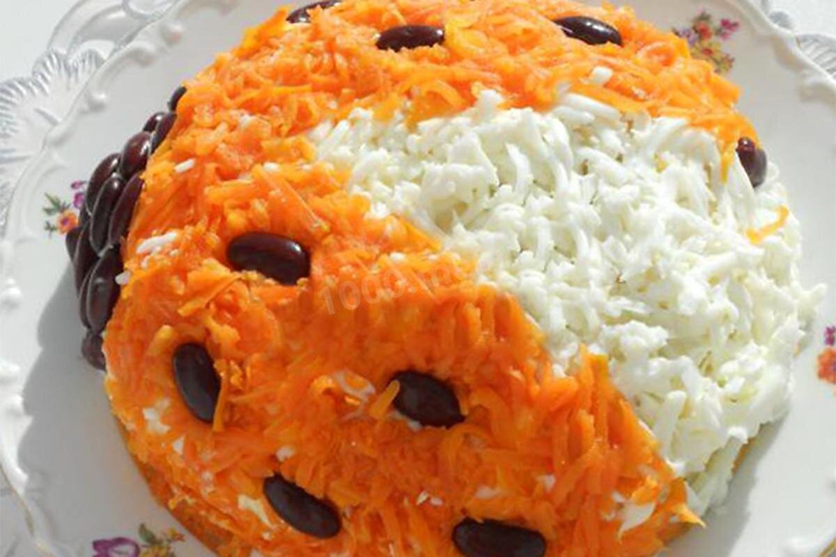 Красивый и экономный праздничный салат никогда не будет лишним! Готовь. Салат с курицей в форме божьей коровки получается сытным и очень вкусным. И, несомненно, красивым. Ингредиенты на 4 порции: Курица - 400 гр. Картошка - 4 шт. Морковь - 2 шт. Майонез - 250 гр. Куриные яйца - 3 шт. Соленые огурцы - 3 шт. Фасоль красная - 50 гр. Соль - по вкусу Перец черный молотый - по вкусу Пошаговое приготовление: 1. Очистите картофель и натрите его на терке. Половину картофеля выложите на блюдо для салата в форме круга. Можно посолить и поперчить. 2. Курицу разделите на волокна (или нарежьте кубиком). Выложите курицу на картошку и смажьте майонезом. 3. Мелко нарежьте маринованные огурцы и выложите следующим слоем. 4. Очистите яйца. Белки отложите в сторону, а желтки разомните вилкой (или натрите на терке) и выложите на огурцы. 5. Покройте все картофелем, посолите и поперчите по вкусу, смажьте майонезом. 6. Очистите и натрите морковь, выложите на салате крылышки коровки. Место для мордочки чуть зао