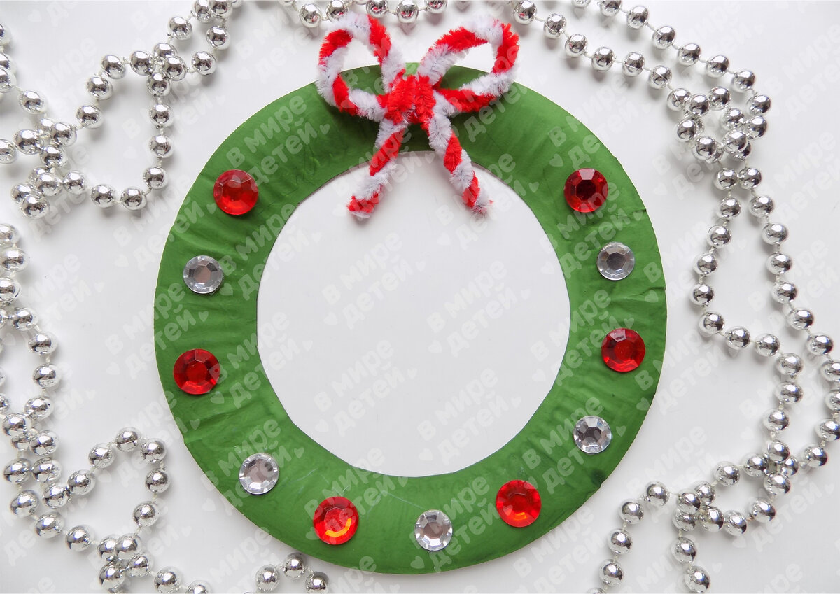 Затем приклеиваем серебристые украшения. Вы можете выбрать декор такого венка на свое усмотрение (в зависимости от того, что имеется под рукой). Наш декоративный венок к Новому году из бумажной тарелочки готов.