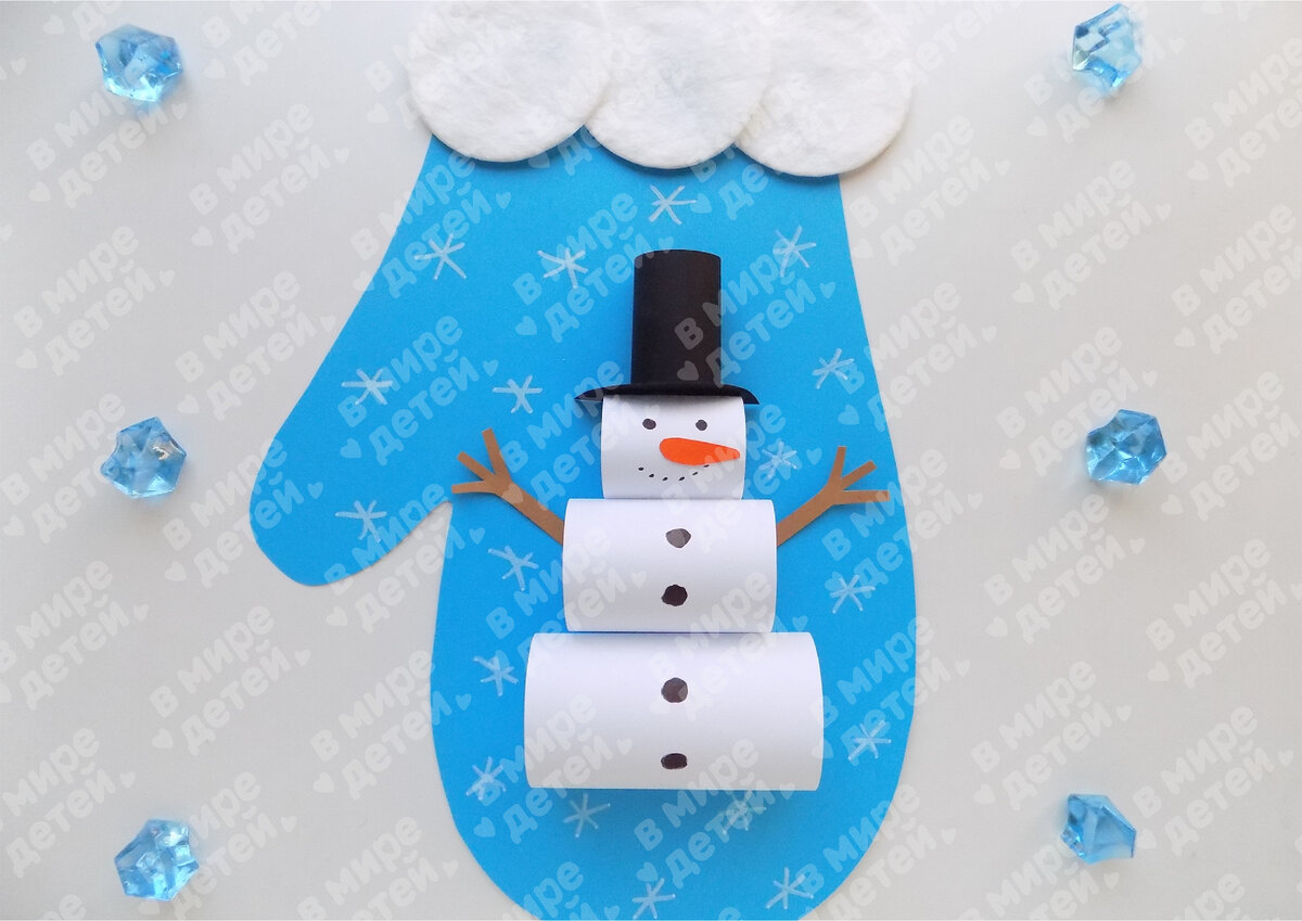 Основными материалами в сегодняшнем мастер-классе будут ватные диски и цветная бумага. А сделаем мы из них объемную зимнюю поделку со снеговиком. Необходимые материалы: · бумага цветная; · ватные диски; · черный маркер; · простой карандаш; · клей; · ножницы; · линейка. Этапы изготовления: Шаг 1 Сначала нам нужно сделать варежку, она будет основой нашей поделки. Вырезаем ее из плотной ярко-голубой бумаги или картона. Шаг 2 Край варежки оформим ватными дисками, закрепляем их с помощью клея. Шаг 3 Затем приступим к созданию снеговика. Для него вырежем из белой бумаги 3 прямоугольника с размерами 15х7 см, 12х5 см и 10х3,5 см. Шаг 4 Берем самый большой прямоугольник, край его смазываем клеем. Затем формируем кольцо. Шаг 5 Приклеиваем его на голубую варежку. Это будет нижний ярус будущего снеговика. Шаг 6 Аналогичным образом делаем заготовки из оставшихся белых прямоугольников. Такая основа для снеговика у нас получилась. Шаг 7 Для шляпы вырежем из черной бумаги полукруг и заготовку размером