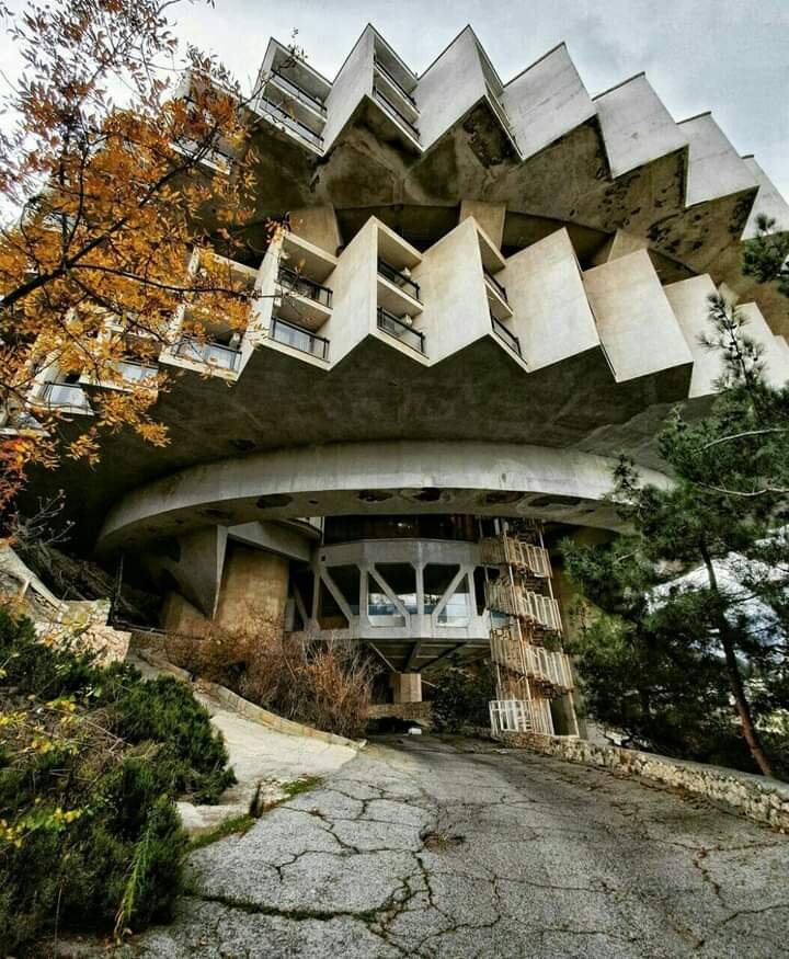 Самый необычный по форме и один из самых известных санаториев Крыма. Спроектирован в конце 1970х, построен к 1985 году. Представляет из себя парящую конструкцию, опирающуюся на три колонны. Санаторий «Курпаты» расположен в одноименном поселке в 8 км от Ялты, между Гаспрой и Ореандой. По внешнему контуру большой "шестерёнки" расположены жилые номера, причём почти все окна выходят на море. В малых "шестерёнках" находится ресторан и столовая. Сейчас санаторий принадлежит "Управлению делами президента". Приобрести путёвку или просто остановиться на ночь, как в отеле, здесь может любой желающий. Правда, лишь весной - на зимний период пансионат закрывается.