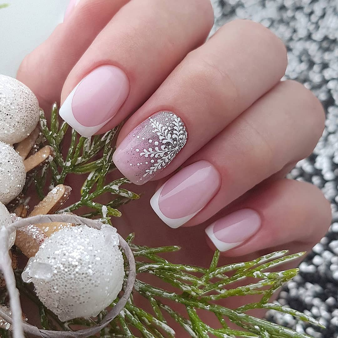Белый френч подходит к любому яркому оттенку гель-лака. Здесь можно разгуляться во всю широту своей фантазии. Дополнить его можно любым новогодним рисунком: снежинки, мультяшные образы, зимние аксессуары, типа, леденцов или рукавичек. С белыми оттенками прекрасно сочетаются вензеля, которые придают легкость маникюру. «Улыбка» может быть дополнена дизайном. Форму «улыбки» для новогоднего френча можно выбрать любую.