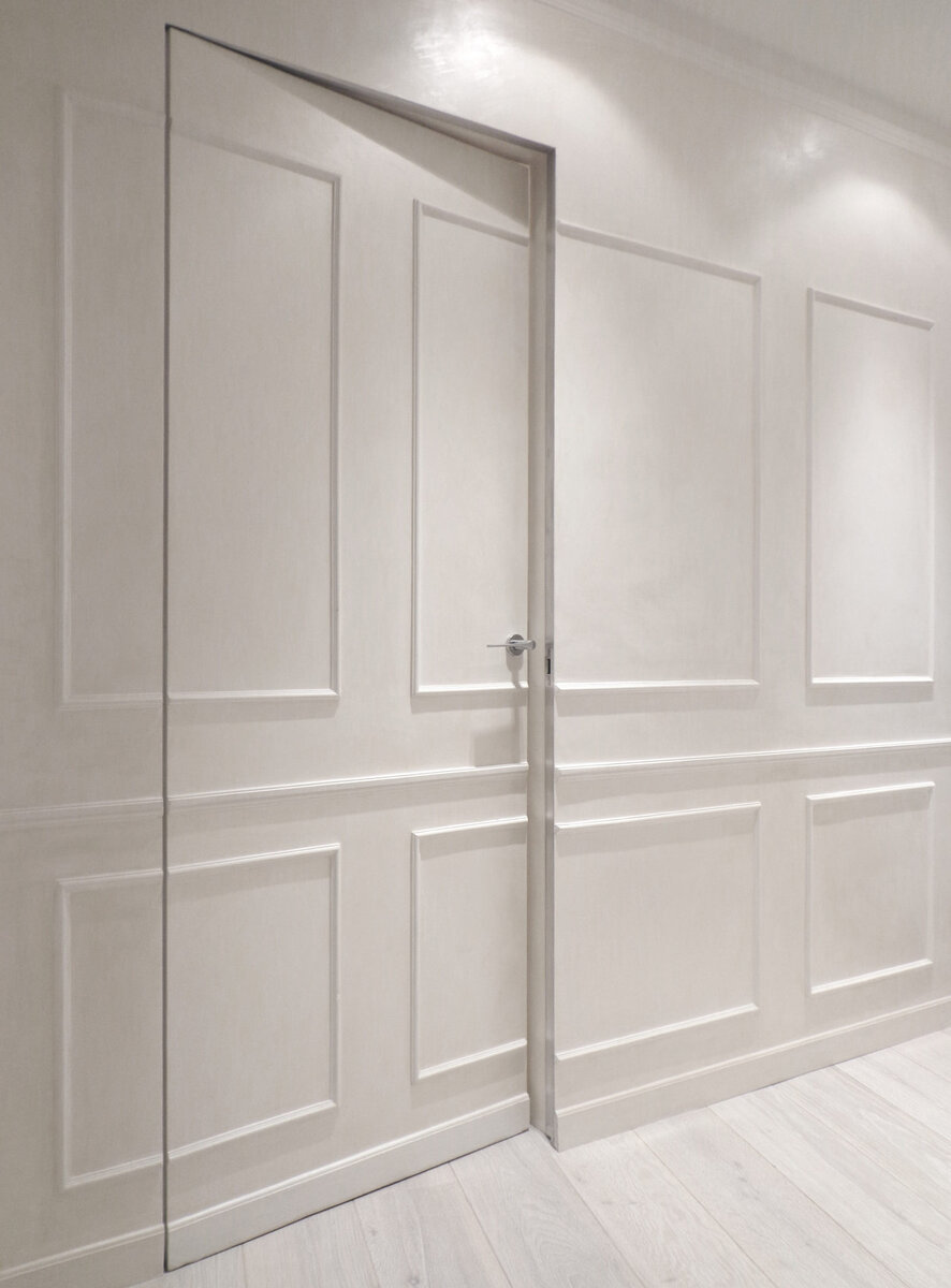 Дверь не имеет наличников, короб интегрируется в стену, а полотно компланарно со стеной, то есть лежит с ней в одной плоскости. Это функционально, модно, необычно и дает большой полет фантазии для дизайна интерьера.