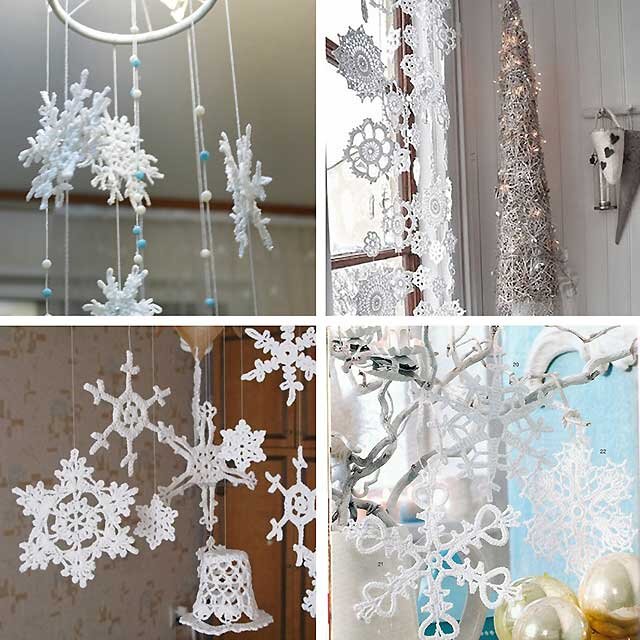 У нас в городе уже поставили новогодние ёлки. В Торговом центре развесили всякие штучки-фонарики. В общем, скоро Новый год, друзья мои. И можно успеть смастерить интересные украшения для дома или офиса. Мне давно хочется что-то такое натворить, но.... рук не хватает совсем. Маленькие маленькие снежинки вязать не сложно, а вот что с ними потом делать? Покажу несколько вариантов использования. 1. Вместо игрушек на ёлочку. Мне кажется, если будут только белые снежинки, фонарики и немного мишуры, получится шикарно! 2. Подвесной модуль на люстре или на другом объемном основании. Можно прикрепить их на рождественский венок, запорошенную ветку или просто на проволочное кольцо на разном уровне и они будут свободно кружиться в воздухе, создавая 3Д эффект. 3. Развес на стене. Если есть однотонная поверхность, можно закрепить на отдельных верёвочках на разных уровнях или сделать плоский модуль, как на втором фото. 4. Гирлянда из снежинок. Ей можно украсить и ёлочку, и развесить где-то. Смысл