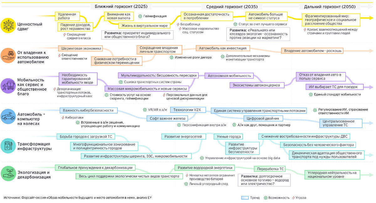 Смотрите какая крутая карта, которую нарисовали по итогу форсайт-сессии EY по будущему российского автопрома и смежных индустрий. В ней приняли 80 представителей компаний: от Яндекса и Делимобиля до VW и КАМАЗа, а еще Энел, «Газпром Нефть», НАМИ и прочие, - и это их, так сказать, консенсус-прогноз. Карта пытается ответить на вопросы о мобильности вплоть до 2050 года: у кого вообще будет автомобиль, как, на чем и куда он будет ездить и тд. Естественно, влияние ESG на все процессы носит тотальный характер. Экология и декарбонизация: текущий период представители индустрии рассматривают как «глобальное принуждение к декарбонизации. На горизонте 2035 года нас ждет параллельно нехватка материалов для батарей, глобальная озабоченность всеми о личном углеродном следе и развитие водорода. И как следствие примерно в это время решится судьба основного топлива автомобиля будущего – водород или электричество? Владение автомобилем: сейчас мы находимся на рассвете шеринговой экономики и смещения о