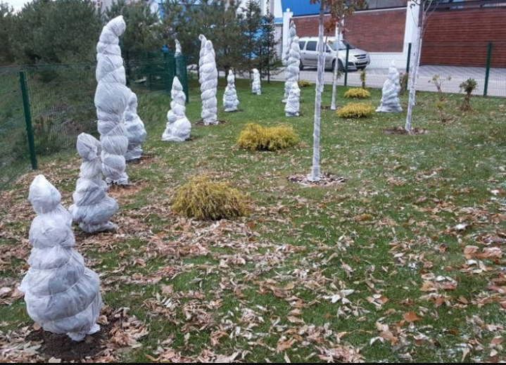 В защите нуждаются молодые деревья, посаженные в нынешнем, прошлом годах, и кустарники, которые не относятся к морозостойким. Саженцы с тонкой корой укрывают первые 5 лет. Зачем укрывать Деревья и кустарники укрывают только после наступления стабильных холодов в районе –5 оС. Если заморозки чередуются с плюсовой температурой, то после укрывания выпреет кора и проснутся почки. Защищаем корни Начните с мульчирования приствольного круга, чтобы сильный мороз не проник к корням. В качестве мульчи нужно использовать материал, который не преет: Укладывать нужно слоем в 10-20 см. Следите, чтобы материал не касался ствола — это предотвратит возможное гниение коры. Нельзя использовать компост или перепревший навоз. Содержащиеся в них питательные вещества могут спровоцировать рост растения в то время, как оно должно находиться в состоянии покоя. Материалы для укрывания Вариант 1: толстая бумага. Ею плотно, без щелей обертывают дерево в несколько слоев, фиксируя каждый из них скотчем. Для защиты о