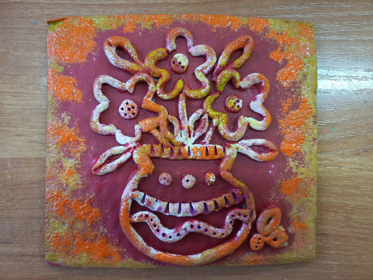 Здравствуйте, сегодня мы познакомимся с барельефом из пластилина. Попробуем сделать простую работу - ваза с цветами. А в будущем вы можете использовать любые сюжеты - это орнаменты, растения, животные и многое другое. Всё зависит от вашей фантазии. Для изготовления барельефа нам потребуется: - картон, - гуашь, - пластилин, - карандаш, - кисть, - губка, - шпажка или любая палочка, для декорирования - баночка с водой. Приступим к творческому процессу🎨 1. Делаем набросок нашей вазы с цветами при помощи карандаша на кусочке картона (я использую картон от упаковочной коробки, он более плотный) 2. Пластилином делаем форму изображения. Нужно скатать из пластилина жгутики и шарики любого цвета и прикрепить к контуру, нарисованному карандашом. 3. Украсить работу можно при помощи шпажки, зубочистки или любой палочки. 4. Теперь всю работу необходимо закрасить гуашью, любым темным оттенком. 5. При помощи губки мы оттеним форму пластилина. Используем светлые оттенки краски. Я использую белую,