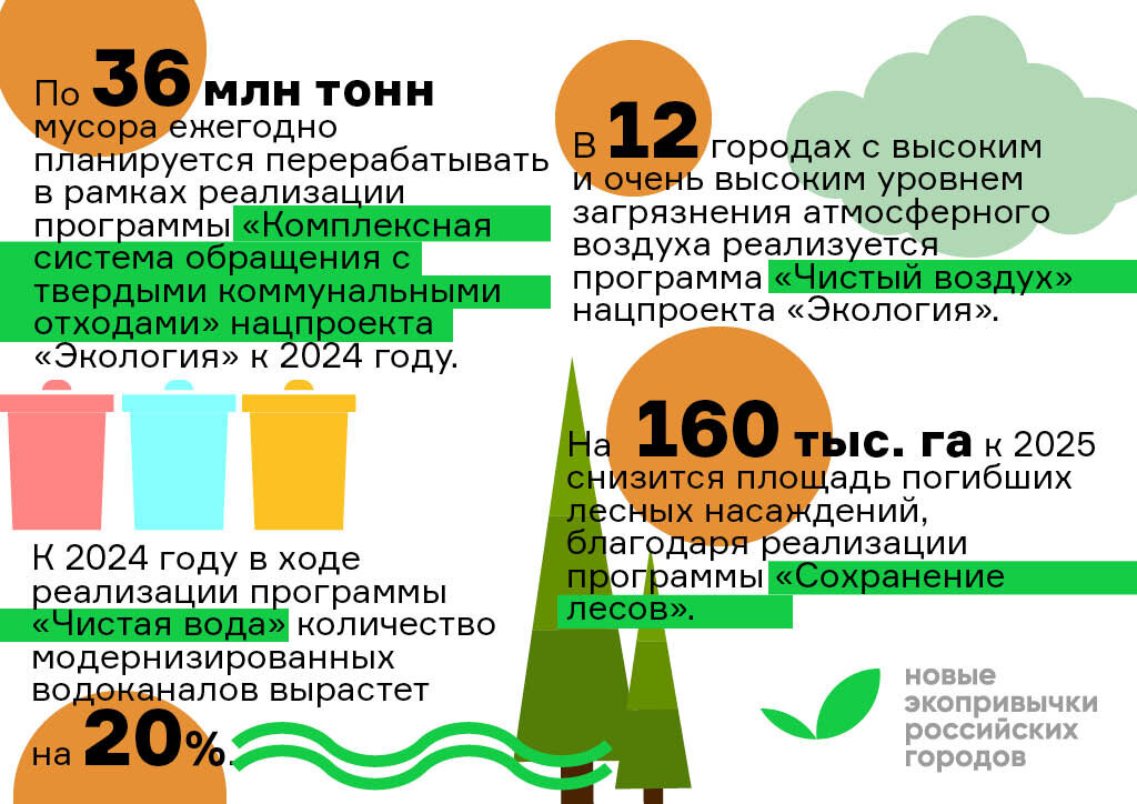 В 2018 году для того, чтобы кардинально улучшить экологическую обстановку в стране и положительно повлиять на оздоровление граждан, был запущен масштабный национальный проект «Экология». Как бы пафосно это ни звучало, но его благая цель — сохранить то, что любо и дорого сердцу каждого россиянина: водные сокровища, такие как Волга и Байкал, сибирские леса, бескрайние просторы донских степей, свежайший воздух Кавказских гор и потрясающее биологическое разнообразие. В этой многосторонней работе принимают участие органы власти, исполнители, кураторы федеральных проектов, общественные организации и граждане. Национальный проект «Экология», безусловно, важная и нужная инициатива. Людей, которые ратуют за сохранение природного богатства России, очень радует тот факт, что подобные проекты разрабатываются и внедряются. Благодаря таким инициативам большие и маленькие города нашей страны становятся чище, уютнее, зеленее. И все-таки для того, чтобы все реализуемые в рамках нацпроекта мероприятия