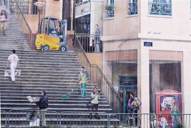 Кроме всего прочего интересного, что я рассказывал ранее, Лион открыл для меня новый вид настенной живописи - современные фрески. Нет, ни разу не граффити. Легальные, неспешные, классические настенные рисунки. Фишка в том, что они вписываются в городской пейзаж так, что ВЕРИШЬ! Веришь, что в окнах домов - настоящие люди... Что лев точит когти о косяк двери... Что с балкона свисает ковер... Что маляр красит стену, не отрываясь и без перерыва на обед... Многому веришь, пока не подойдешь ближе. Лионские фрески называют тромплёй - "обман зрения". В городе около 250 таких "обманов". Почти все появились в последнее двадцатилетие. Самая большая - стена ткачей (стена Каню на Круа-Рус). Ее площадь 1200 кв. метров. Когда смотришь на фасад дома, создается впечатление, что вверх идет лестница, где-то там наверху теснятся дома, среди которых суетится народ... Но это ОБМАН. :))) Никаких людей, лестниц и домов. Все нарисовано на плоском фасаде ОДНОГО ДОМА! Другая знаменитая фреска - дом в