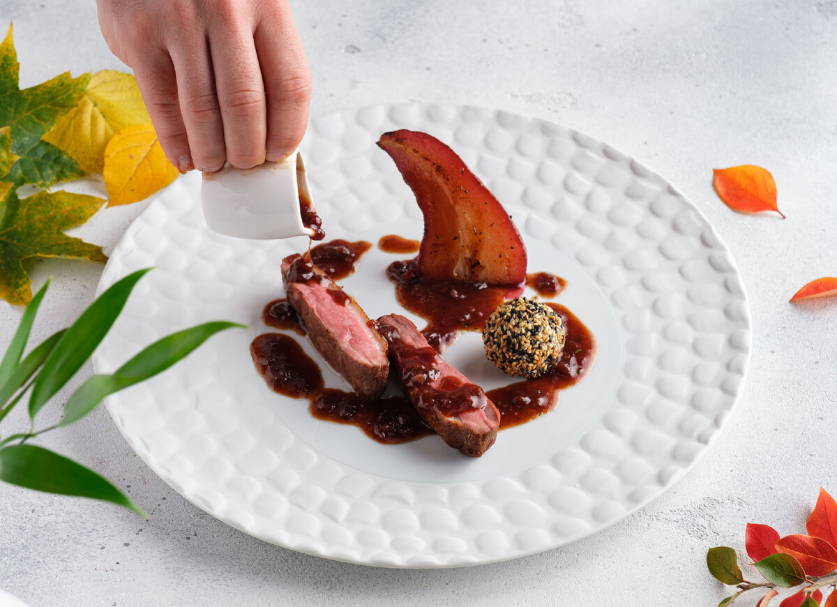 - Утиную грудку разрезать на две части и выложить на тарелку, рядом – половину груши и картофельные шарики. Перед подачей полить блюдо получившимся соусом.