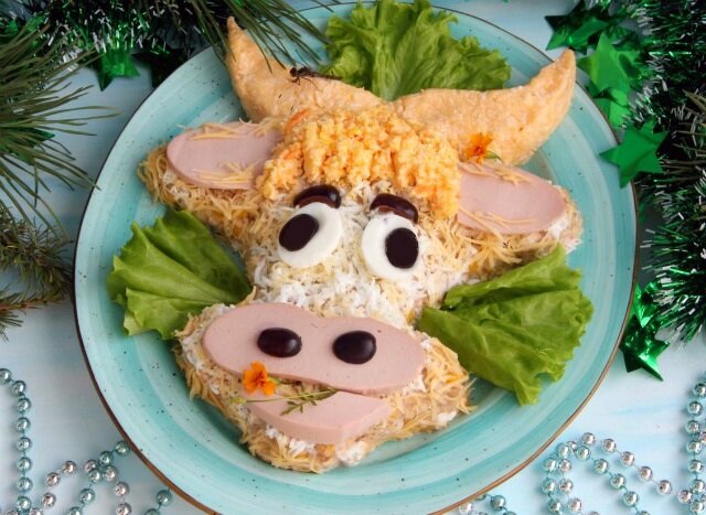 Фотогеничный символ Нового года на твоем столе! Главный праздничный салат не только украсит застолье, но и может привлечь удачу. Ведь наступающий год будет годом белого быка, он может стать вашим талисманом. Всё чаще мы обращаемся к восточному календарю, а почему бы и нет? Поверим в удачу!