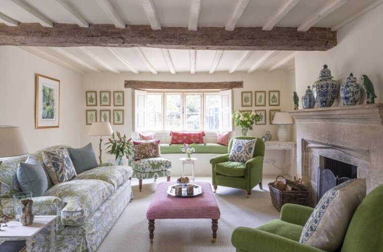 Дизайнеры использовали простую, но вдохновляющую смесь цветов, чтобы преобразить гостиную в загородном доме. Этот проект начинался как чистый холст. Конструктивно дом был в идеальном состоянии, но что касается схемы, то начинали с нуля с четырьмя белыми стенами. Суть этого проекта заключалась в том, чтобы создать комнату, которая была свежей и умной, но не слишком формальной. Отправной точкой был выбор ограниченной цветовой палитры синего и зеленого с акцентами розового, чтобы добавить немного тепла. Диван и кресла - сочетание мебели с ножками и дивана с юбкой. Слишком много ткани может вызвать клаустрофобию, но, в равной степени, слишком много дерева может выглядеть неудобно, поэтому старались достичь баланса. Боковые столики окрашенные в белый цвет. Для отделки дивана использовалась сине-зеленая ткань с цветочным рисунком. Это придало ему более элегантный и индивидуальный вид. Центральный пуфик обтянут розовой тканью. Синий и зеленый без дополнительных акцентов могут выглядеть слишко