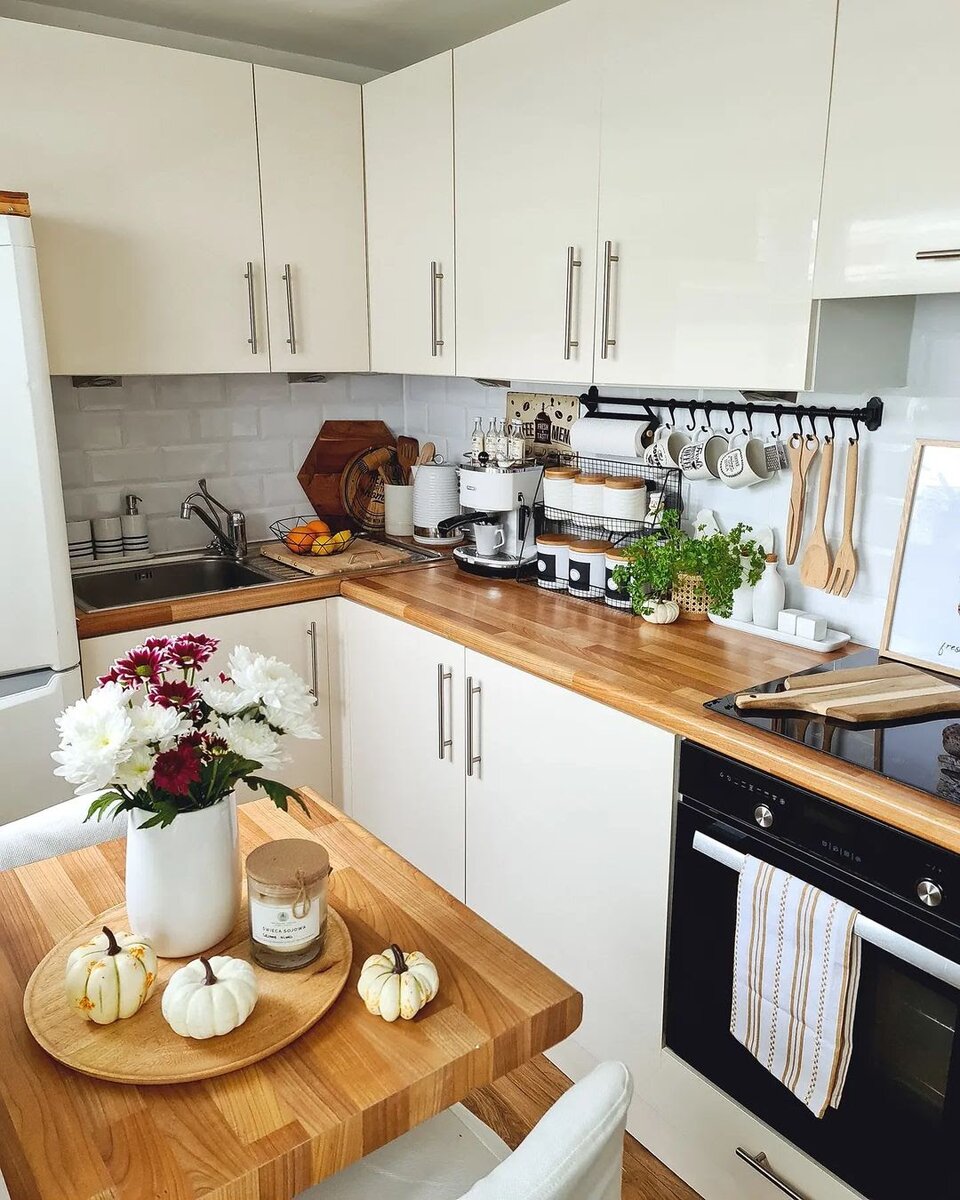 Чаще всего мы показываем вам родные отечественные интерьеры. Всё-таки они ближе, да и пользы от демонстрации планировок хрущёвок и брежневок больше. Можно вдохновиться, посмотреть, сделать что-то похожее у себя. Но бывают исключения. Кухня Сильвии, которая живёт в Англии, как раз из таких. Согласитесь, при взгляде на помещение сложно понять, что это не обычная пятиметровка в Москве или Санкт-Петербурге? Тем не менее, так и есть. Кухня расположена даже не в квартире, а в доме — и тем удивительней её крошечная площадь. И уж тем более непонятно, зачем располагать на такой узкой малютке ещё и обеденный стол. Пусть и на две персоны, но он занимает место. При том, что в столовой есть второй, очень просторный. Но главное, чтобы владельцам было удобно. Наше дело — показывать. Холодильник, посудомоечная машина, полноформатный духовой шкаф и панель на 4 зоны приготовления: техники поместилось немало, готовить удобно. Нашлось место и для кофемашины с чайником. Правда, на этом фото видно, наскольк