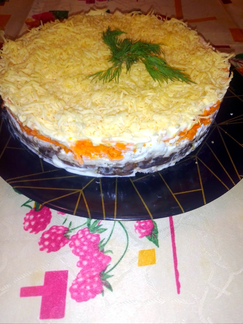 Морковь по-корейски мелко нарезаем и выкладываем следующим слоем.