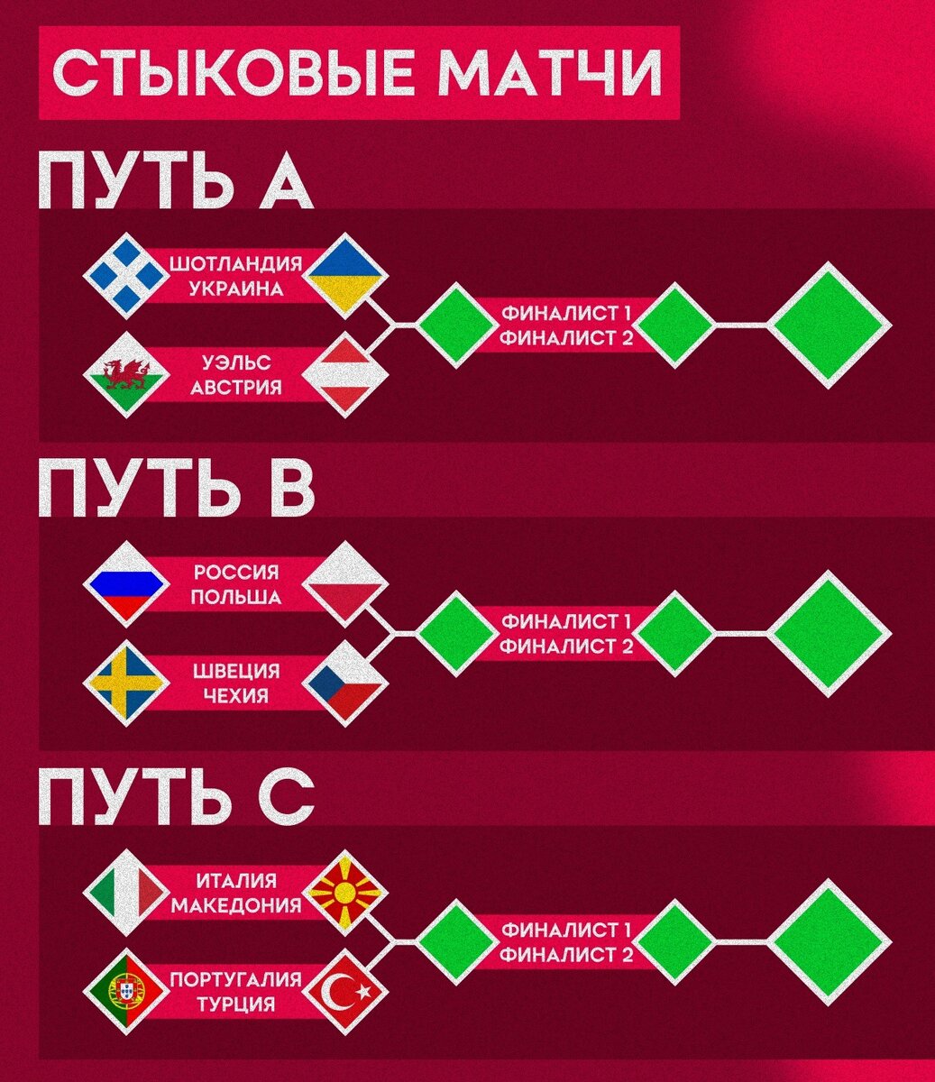 Сегодня состоялась жеребьёвка стыковых матчей на Чемпионат Мира от Европы. Турнир пройдёт в два этапа сначала полуфиналы 24 Марта, а финальные матчи 29 Марта 22 года. На ЧМ пройдут три команды из Группы А, В и С. Путь А. Я бы назвал этот путь самым простым, среди сборных нет мировых грандов и команды равны между собой. Шотландия - Украина Интересная пара, в которой нет фаворита. История личных встреч насчитывает всего 2 матча, примечательно то что хозяева в этих встречах всегда оказывались победителями. В этот раз Шотландия будет хозяином встречи и своё предпочтение я отдам именно им. У Шотландцев крепкая и слаженная сборная, которая хорошо играет в оборонительный футбол, при этом неплохо использовав свои стандарты в нападении. Украина после смены тренера наоборот не является сплочённый коллективом, хотя талантливых футболистов у украинцев достаточно, чтобы противостоять Шотландии. Поэтому нас ждёт интересный матч, где сразятся сборные с разным стилем игры. Уэльс - Австрия Статисти
