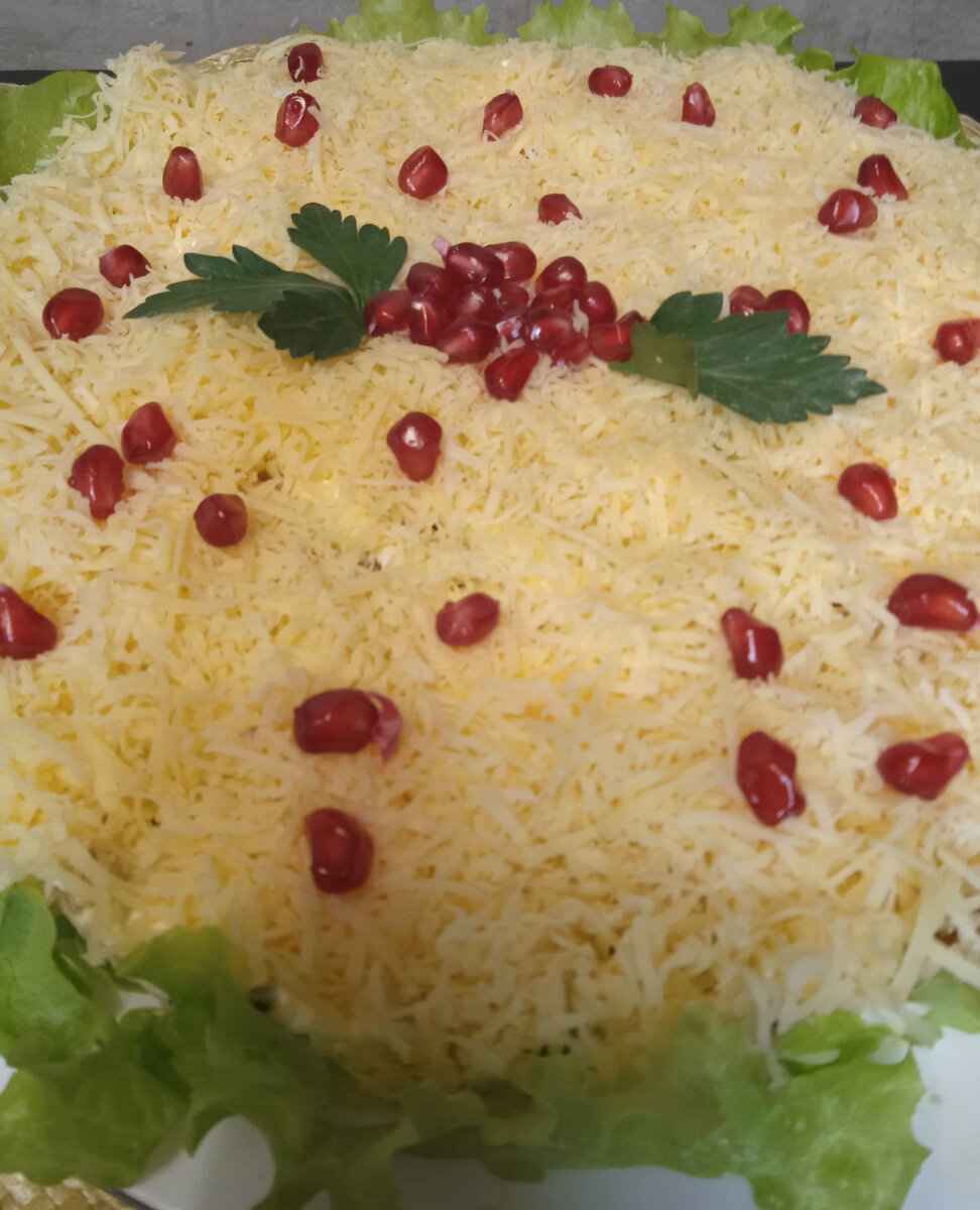 Готовим слоёный салат "Нежность" с курицей, орехом и черносливом