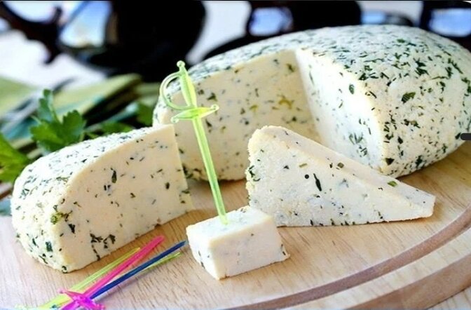 Многим людям нравится сыр, но пробовали ли вы когда-нибудь приготовить свой собственный? Сейчас я вам покажу как это можно сделать даже в домашних условиях! Какие ингредиенты на необходимы: - 1 литр кeфира - 1 литр молока - 6 яиц - 4 ч.л. соли (или по вкусу) - 1/3 ч.л. красного острого перца - щепотка тмина - 1 зубчик чеснока - небольшой пучок разной зелени: укроп, кинза, зелёный лук Способ приготовления нашего сыра: 1. В кастрюлю выливаем молоко и кефир, и ставим на плиту. Не доводя до кипения, вливаем тонкой струей в горячую нашу молочно-кефирную смесь слегка взбитые с солью яйца. Доводим смесь до кипения и помешиваем её на маленьком огне в течении нескольких минут, до тех пока не отделится сыворотка. 2. Снимаем с плиты, давая остыть 1-2 минуты и добавляем мелко нарубленную зелень и красный перец, после выдавливаем один зубчик чеснока. 3. Пропускаем массу через дуршлаг, застелянный марлей, сложенной в два слоя. Ровняем сырную массу ложкой. 4. Закручиваем марлю узлом, и д