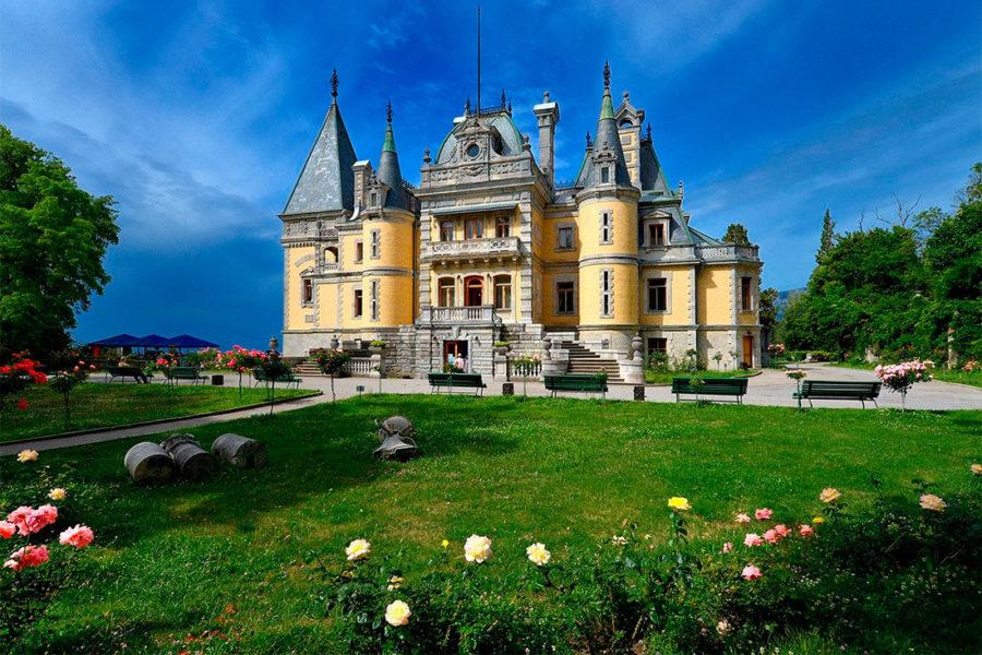 Трехэтажная постройка в стиле Ренессанса. Рядом находятся роскошные ландшафтные парки, наполненные высокими соснами