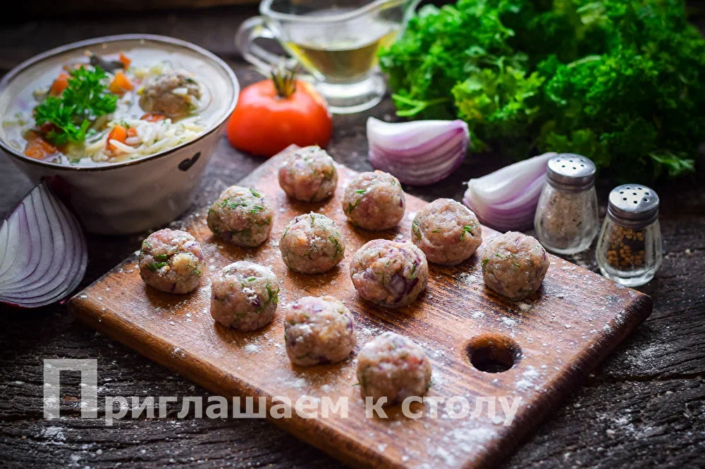 «Фрикадельки как у шеф-повара», — отметил супруг, попробовав мой суп за ужином. Действительно, рецепт мне удалось узнать у повара кафе, в котором мы недавно были с подругой. Теперь готовлю суп только так, но у меня есть пара секретов, которые помогают сделать блюдо еще вкуснее, но об этом в конце. Необходимые ингредиенты для приготовления фрикаделек: Батон нарезаю или ломаю на кусочки, складываю в миску и заливаю молоком. Даю ему хорошо размокнуть в течение 15 минут, затем вынимаю и отжимаю лишнюю жидкость. Мясо нарезаю кубиками примерно 4 на 4 см, лук очищаю и разрезаю на 4–6 частей, складываю все ингредиенты в чашу блендера и тщательно измельчаю до получения однородной массы. Перекладываю фарш в глубокую миску, добавляю соль и перец по вкусу, мелко рубленный укроп и тщательно перемешиваю. Затем отбиваю фарш в течение 7-8 минут — это придаст ему однородную структуру и позволит фрикаделькам не разваливаться в процессе приготовления. Такой способ подготовки мяса исключает необходимость