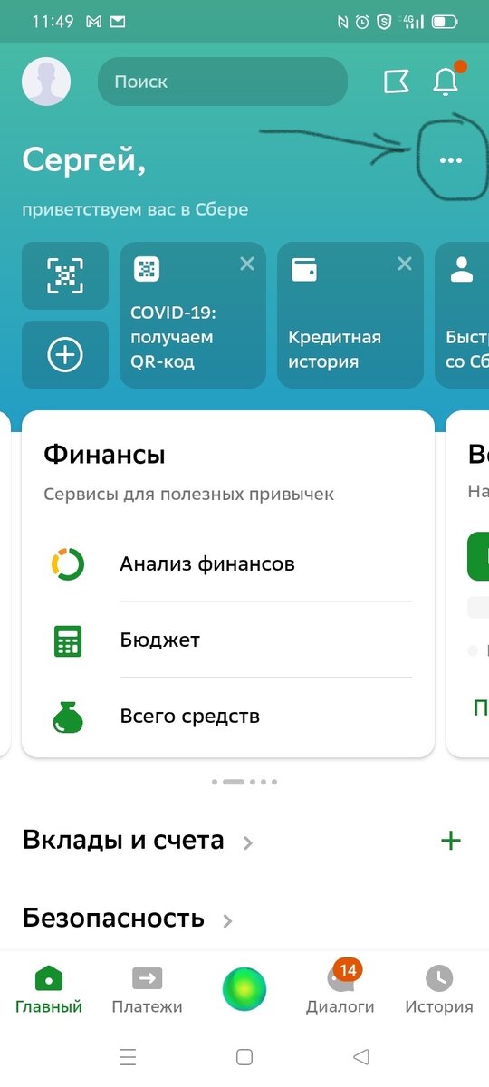 1. Открываем мобильное приложение СберБанк Онлайн. Набираем код доступа и попадаем на главную страницу. напротив вашего имени, справа, жмем на три точки.