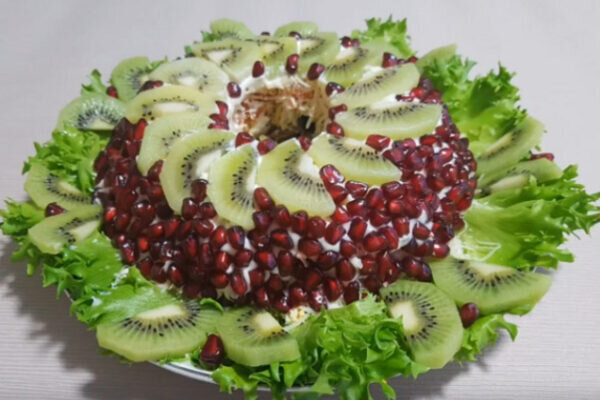 Новогодний салат "Девичий каприз" с черносливом, киви и гранатом