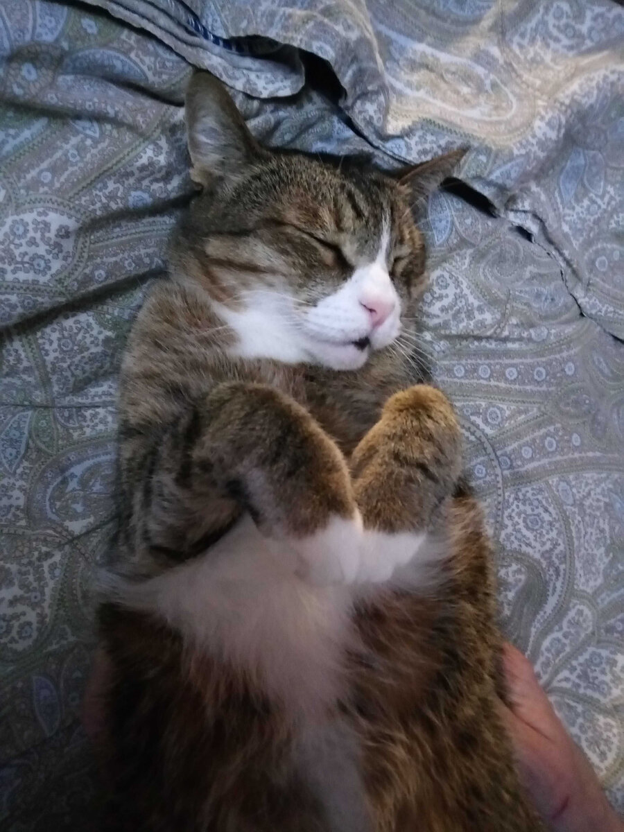 Это личный и персональный кот моего мужа. Когда Митрофан появился в нашем доме, у него был очень скверный характер. Он кусался, царапался, шипел и подвывал. До нашей свадьбы он жил один с моим супругом и был дико избалован. Мой муж варил ему рыбку, выбирал косточки и ходил упрашивал покушать. Котяра не терпел панибратства и рук. Однако сейчас это добрейшее животное, которое мухи не обидит. Мои дети таскали кота, несмотря на его вопли и агрессию, и потихоньку характер Мити изменился и дошел до состояния "валенка". А муж не верил, говорил что никогда такого не будет, а оно-стало! Так что даже закоренелые человеко ненавистники кошачьего племени могут переменить свое отношение к гомо сапиенсам. Ради еды Митрофан готов буквально на все. И сейчас, в условиях жесткой конкуренции (5 хвостов!)он кушает абсолютно все. Макароны - давай, гречка- тащи ее сюда, картошка - вау!