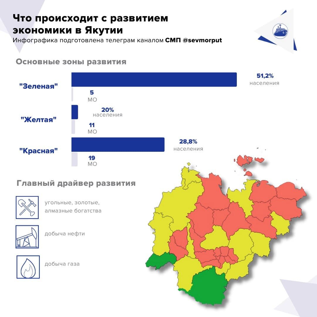 В сети появилась информация о муниципалитетах Якутии, которые были ранжированы по уровню социально-экономического развития - в республике оно неравномерное. При этом половина населения проживает в экономически неблагоприятных МО. Отчасти опубликованная карта перекликается со Стратегией социально-экономического развития Якутии на период до 2035 года, где также обозначены болевые точки. К «зеленой» лидирующей зоне относится всего 5 муниципалитетов из 34, включая столицу региона. Здесь проживает чуть больше половины населения всей республики. Основной драйвер таких территорий — развитая промышленность. К «желтой зоне» (есть проблемы, но их возможно устранить) относятся 11 районов Якутии, тут сосредоточена пятая часть населения региона. К «красной» депрессивной зоне относятся оставшиеся 19 МО, здесь живут почти 30% населения арктического субъекта. Судя по карте, географически сюда относятся почти все северные и центральные районы Якутии. Если негативная тенденция сохранится, а власти не см