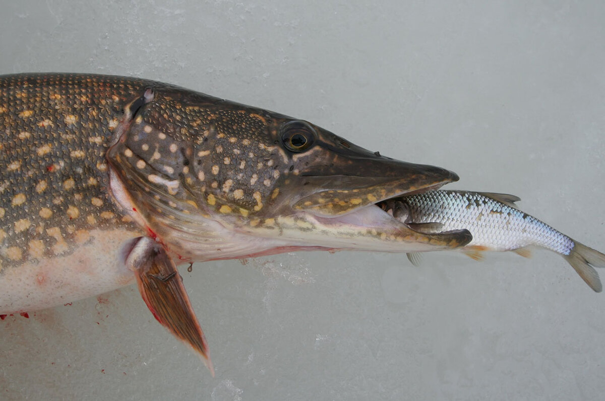 Две встречи со щуками Оба случая связаны с сетью. Как-то я охотился за щуками в мелководном заливе и случайно зацепил вертушкой сеть. Я подтянул ее к лодке, чтобы отцепить блесну. И вдруг сильный удар, и сеть вырвалась из рук. В досягаемом для обозрения месте внизу сетки была только крупная плотва, прямо подо мной на дне. Плотва была блестящая и на темном дне ее было отлично видно. А другой рыбы не было. Я решил, что крупная рыба попалась в сеть где-то метрах в пяти от меня. Но она же не моя и я снова занялся освобождением блесны. Но и в этот раз сеть «вырвалась» из рук. Но на этот раз что-то изменилось. У плотвы остались видными только голова и хвост. Чудеса какие-то. Приглядевшись я увидел, что крупная щука держит плотву поперек, сама при этом не касаясь сети. Спина у щуки темная и на фоне дна ее не видно. Щука еще пару раз мотнула головой, вытаскивая плотву, но не получилось. Так и стоит, не выпуская рыбу из пасти. Я взял подсак и попытался подцепить им щуку, но это ей не понравил