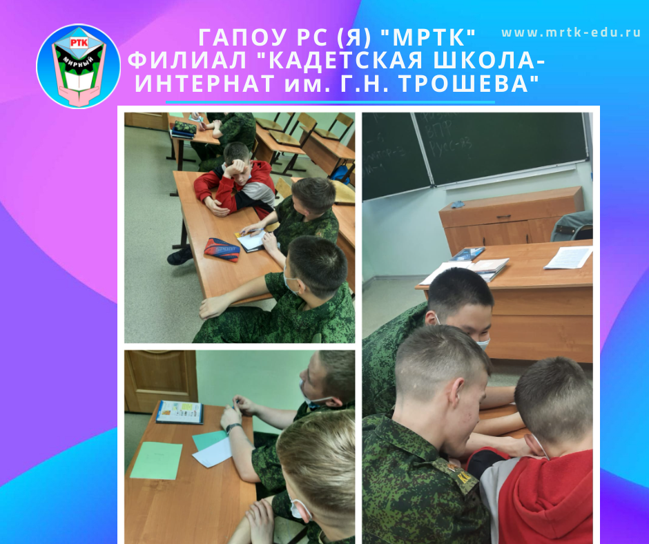 В ГАПОУ РС (Я) «МРТК» филиале «Кадетская школа-интернат им. Г.Н. Трошева», в рамках подготовки к экзаменам, в 11 классе педагог-психолог Инна Васильченко провела тренинг «Мой мотив выбора профессии». Ребятам был предложен ряд наиболее распространённых мотивов выбора профессии. Методом выборки кадеты определили для себя основополагающие мотивы, обсудили профессии, которые позволят достичь желаемых результатов. Одним из элементов тренинга было упражнение «10 слов». Кадетам необходимо было разбиться на команды, записать девять любых слов, не связанных между собой по смыслу. Десятое слово одинаково для всех команд – «экзамен». Задача заключалась в написании сочинения из 10 предложений, используя записанные слова. По окончании ребята зачитывали свои творения и дружно обсудили итоги тренинга. Лариса Батлаева, педагог-организатор. Пресс-служба ГАПОУ РС (Я) «МРТК» филиал «Кадетская школа-интернат им. Г.Н. Трошева». #КШИ_Трошева кадеты #кадетскаяшкола #Чернышевский #КШИ #МРТК Ссылки по теме: