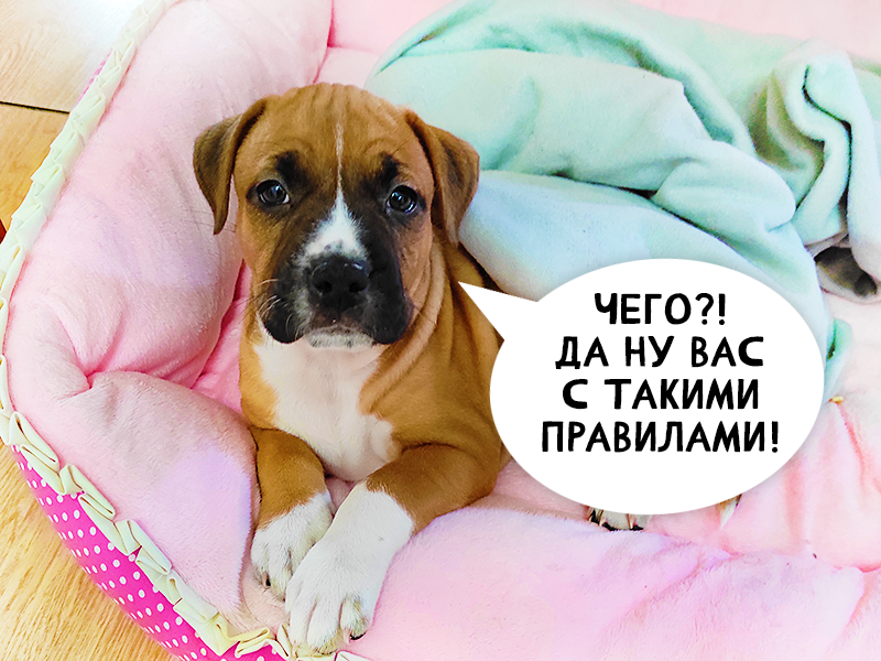 Когда люди заводят собаку, у них в голове своё представление о том, какие запреты и ограничения будут действовать для нового члена семьи. Однако мохнатый жулик вносит в эти правила свои корректировки, потому что мало кто может устоять под натиском обаятельной щенячьей мордашки. Изначально, мы, начитавшись литературы от гуру-кинологов, планировали установить для щенка жёсткие рамки. В этой публикации я расскажу вам, что из этого получилось. Правила для нашей собаки были такими. Рокси. 1,5 месяца. Собака должна спать только в отдельной комнате и только на своей лежанке. Забираться на диван ни в коем случае нельзя! Рокси. 3 месяца. Собака может спать на старом диване в отдельной комнате. Заходить в нашу спальню ни в коем случае нельзя! Рокси. 5 месяцев. Ну хорошо, собака может спать в нашей спальне, но на отдельном диванчике. Залезать на кровать ни в коем случае нельзя! Рокси. 6 месяцев. Ну ладно, собаке можно залезать на кровать, но только днём, когда кровать застелена, и только в