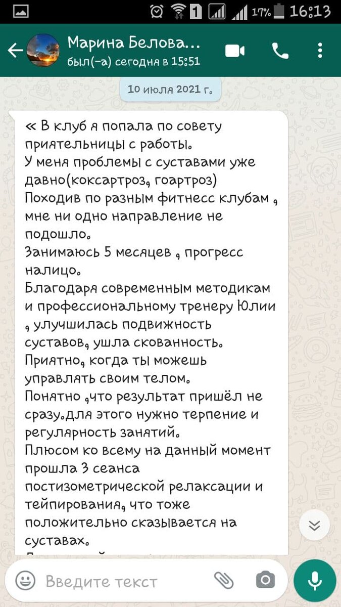 Марина продолжает занятия в нашем оздоровительном центре. Плюсом к уже описанным ею эффектам она похудела, хотя изначально мы не ставили перед собой такую цель и нагрузка на тренировках достаточно щадящая. С Татьяной у нас идет долгая работа по восстановлению подвижности руки и улучшению подвижности левой стороны тела. Скажу сразу, кроме занятий и тейпирования Татьяна использует и другие методики ( например, сеансы иглоукалывания, лечения электомагнитными токами и пр.). Все в совокупности дает нам очень хорошие результаты: - улучшилась координация движений, - мышечная сила, - состояние суставов, особенно плечевого (исчезла боль). Процесс долгий, но мы идем к своей цели! Инна - наша трудяга! Когда она пришла к нам ее руки поднимались в плечевых суставах только на 45%. Сейчас Инна полностью восстановила объем движения в плечах. Мы продолжаем не без переменного(!) успеха решать и другие задачи. Но, главное работать и работать, не бросать на половине пути постоянно искать способы