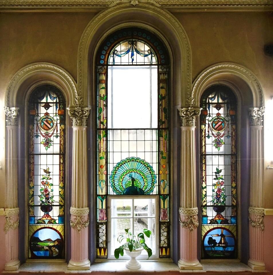 Доходный дом Дернова на Таврической, 35 в Петербурге узнают по высокой круглой башне на углу. Это – знаменитая «Башня Вячеслава Иванова». В начале ХХ века известный русский поэт, литератор и философ снимал квартиру на последнем этаже башни, в мансарде. По средам в период 1905-1912 гг. устраивались чтения, на которые собирался весь литературный цвет Петербурга. Квартира в той же парадной справа от общей лестницы особенная, она занимает не один, а два этажа. Это высокое пространство с собственной роскошной лестницей внутри, лепниной, росписями и витражами. Сейчас в этом помещении находится детский сад. Витражи в тройном окне – одни из самых эффектных в Петербурге. В них стиль модерн сочетается с неоклассицизмом. Чего здесь только нет: вазы с цветами, павлин, гербы, гирлянды, пейзажные вставки… Фрагмент витража из этого дома размещен в красочном настенном календаре на 2022 год, на листе за февраль месяц. Остальные 11 страниц с другими – самыми изысканными петербургскими окнами. Вы
