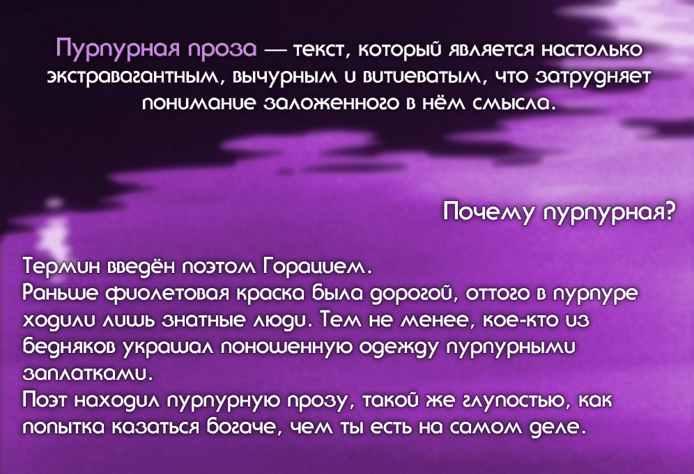 У многих авторов был период, когда большая часть написанного, являлась пурпурной прозой, но учитывая, что среди них были чрезвычайно успешные авторы, которые преуспели за счет подобного приема, то пурпурная проза не самое худшее, что вы можете сотворить.