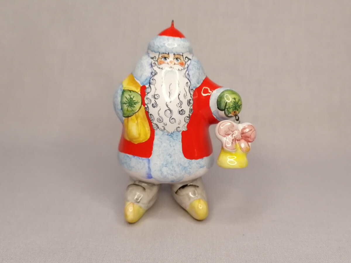 Всем здравствуйте! И снова Дед Мороз. Я уже накануне писала, что у меня нет Деда Мороза, под елочку. Зато есть керамические. Но все они достаточно юные и маленькие, для моей ёлки. Да и керамические не поставишь под елку, мало ли что. Поэтому просто ставлю, как украшение. Ярославская майолика. Этого Деда Мороза мне подарила моя подружка, на Новый год. Самый хороший и настоящий новогодний подарок. У него наверху есть петелька для подвешивания, но я не думаю, что это новогодняя игрушка, по крайней мере я боюсь его вешать на елку, мне кажется, что он тяжелый для этого. Поэтому я его просто ставлю, на стол или пианино. К руке Деда Мороза подвешен колокольчик. Хотя я очень аккуратно отношусь и бережно храню его, но со временем на месте крепления колокольчика появились небольшие сколы. Ярославская майолика достаточно молодое предприятие, основано в 1992 году, но у него уже есть свои поклонники, хотя ценник у них довольно высокий. Ручная роспись. Высота 10 см. И еще один Дед Мороз. Это уже к