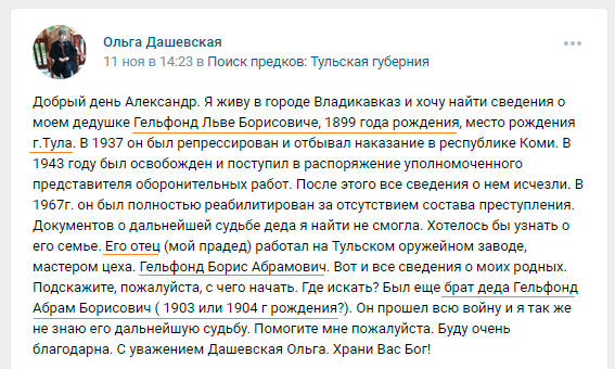 Несколько дней назад в нашем сообществе появился вопрос. Ольга интересуется, как начинать поиск своих корней. Давайте на этом примере постараемся разобраться, что можно сделать. Первым шагом уточняем годы рождения тех, кто участвовал в ВОВ. Находим на сайте "Память народа": Гельфонд Абрам Борисович. Заодно по фамилии и месту рождения находим потенциальных родственников. Обнаружился: Гельфанд Исаак Моисеевич (двоюродный брат). Теперь обратимся к метрическим книгам еврейской общины города Тулы 1885-1915 гг. (ГАТО ф.93) 13.09.1909 в городе Туле у мещанина Белыничского общества Могилёвской губернии Бенциона Абрамова Гельфанда и жены его Леи родился сын Абрам. 20.02.1900 в городе Туле у мещанина Белыничского общества Могилёвской губернии Мовши-Арона Абрамовича Гельфанда и жены его Леи Абрамовой родился сын Исаак. 17.07.1899 в городе Туле у Белыничского мещанина Бениамина Абрамова Гельфонда от жены его Леи Моисеевны родился сын Аарон-Лев. Написание имён очень вариативно. Борис-Бенцион-Бениам