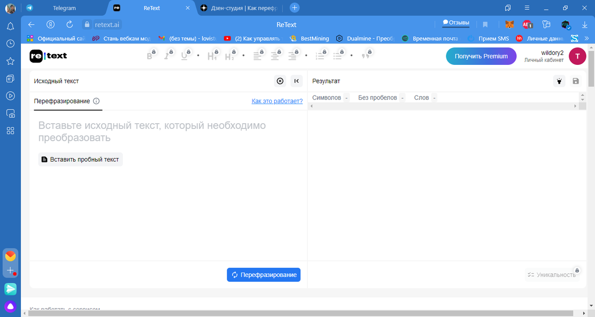 «ReText» качественно и быстро изменит ваш текст с помощью искусственного интеллекта. Смысл статьи будет полностью сохранен, но текст будет выглядеть по-другому. При всем этом, сервис грамотнее выразит вашу мысль и исключит грамматические ошибки. Все, что нужно сделать - это вставить исходный текст или загрузить документ в левую часть редактора и нажать голубую кнопку внизу. В правой половине мы увидим выделенную желтым часть текста, которая была изменена. Не благодарите)