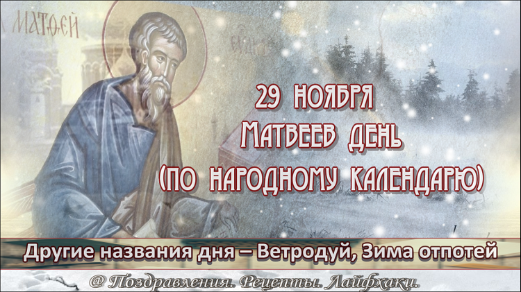 Здравствуйте! В календаре народных традиций и примет 29 ноября называется – Матвеев день. Верующие в этот день вспоминают – апостола Левия Матфея (I век), одного из двенадцати апостолов и автора Евангелия от Матвея. В этот день к Святому обращались с просьбой помочь найти хорошую работу, сохранить семью и благополучие в доме. Очень часто именно в этот день бывает оттепель, после которой начинаются сильные ветра. С приходом холодных ветров у народа были свои поверья. Люди считали, что сильный и холодный ветер разрушает не только постройки, но и вызывает тяжелые болезни – ревматизм суставов или ветряную оспу. В этот день одетая наизнанку вещь – к неудаче и убыткам. Во второй день Рождественского поста люди старались не нарушать запреты этого дня – не ссорились, не ругались, не выполняли тяжелую физическую работу, ели постные каши с растительным маслом, спокойно отдыхали в кругу семьи или родственников и размышляли о своей жизни. А у древних славян во времена язычества 29 ноября был семей