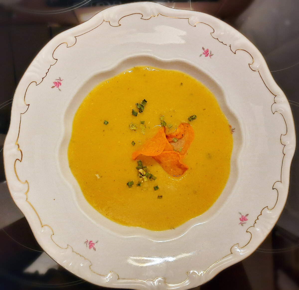 - Снимаем с огня, доводим блендером до состояния красивого и гладкого пюре и подаем с зеленью или мясными чипсами или джерками (у меня чипсы куриные из вкусвилл).
