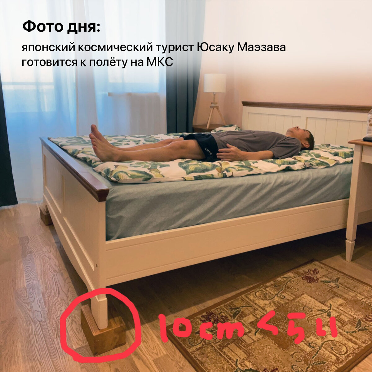 В состоянии невесомости у космонавтов кровь перераспределяется от нижних конечностей к голове. Чтобы подготовиться к этому, Юсаку Маэзава (Maezawa Yūsaku) начал спать под небольшим отрицательным углом (10-сантиметровые бруски под ножками кровати). Он и его помощник, Йозо Хирано, отправятся на МКС в составе экипажа «Союз МС-20» под управлением Александра Мисуркина уже 8 декабря. Вернутся они на Землю через 12 дней.