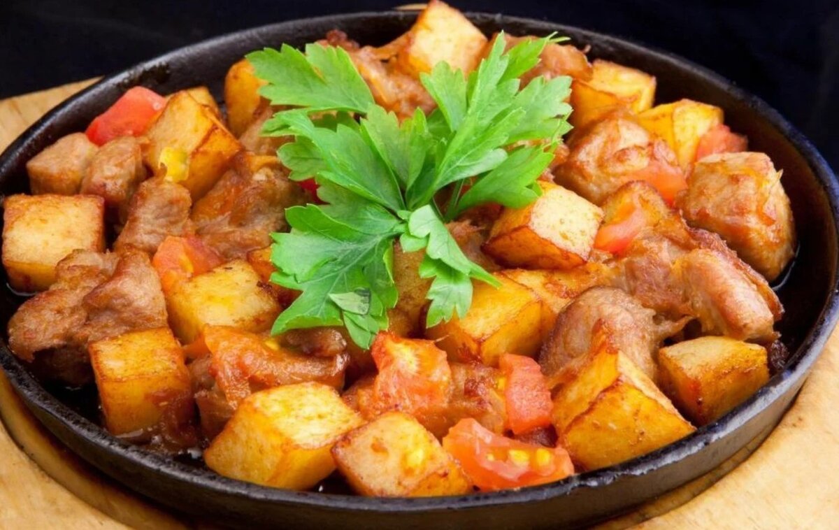 Вынимаем лук и кладем его к мясу. В сковороду добавляем сливочное масло. Обжариваем картофель, солим, перчим, сыпим молотый кориандр, рубленный чеснок и петрушку.