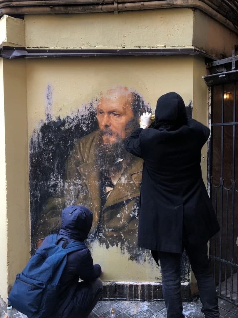 Портрет Достоевского, нарисованный на стене в Кузнечном переулке Петербурга, отмыли от краски.