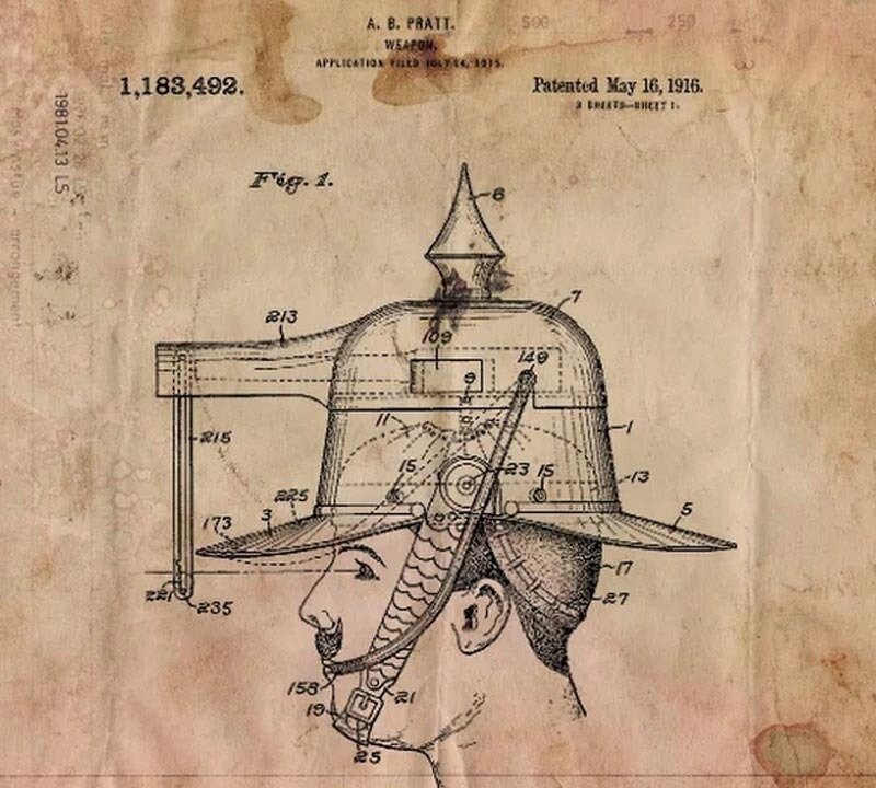 Шлем-пистолет. На самом деле стреляющий шлем это никакая не шутка, а совершенно уникальная конструкция американского изобретателя Альберта Пратта, запатентованная в 1916 году. Устройство представляло собой шлем, в верхней части которого располагался многозарядный, полуавтоматический пистолет. Чтобы выстрелить из шлема-пистолета, достаточно было подуть в специальную трубку. Воздух из нее поступал в надувную "грушу", размеры которой увеличивались и тем самым она воздействовала на спусковой механизм пистолета. На уровне глаз стрелка находился щиток с прицельным приспособлением. Стреляющий шлем разрабатывался для военных, но они отказались от него из-за явной громоздкости и опасений, что отдача будет ломать стрелкам шею. Однако, в 2011 году удалось изготовить точно такой же шлем-пистолет и в ходе испытания было доказано, что стрельба из него вполне реальна. Но, вопрос о том, как в боевых условиях вести стрельбу из шлема-пистолета очередями так и остался открытым. Пата. Возможно, выражение