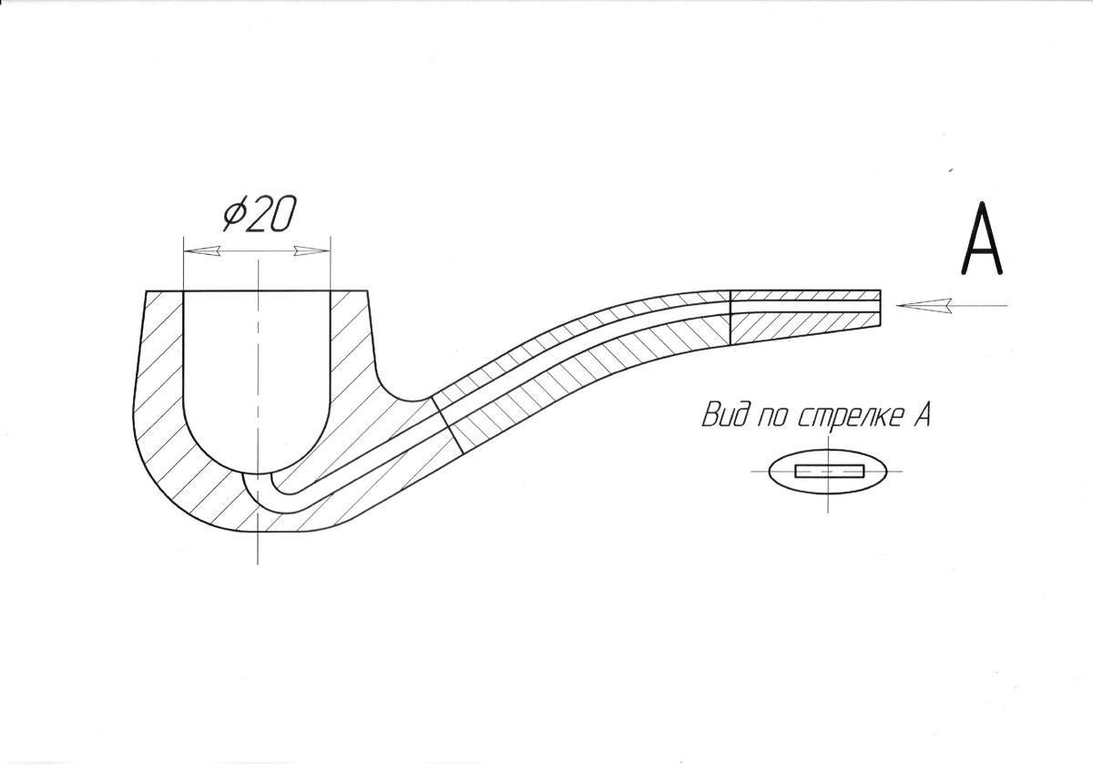 Основная часть – это, конечно, чаша. Именно её надо выполнять из наиболее твердых (вернее сказать термостойких) материалов. Внутренний объём камеры, в которую помещают табак, обычно примерно равен объёму сигареты, и имеет диаметр около 20 мм. Продукты тления табака (табачный дым – собственно целевой продукт курения) по дымовому каналу из камеры горения должен попасть в рот курильщика. Чтобы обеспечить лучшие условия горения и наибольшую полноту сгорания табака, канал должен выходить из камеры снизу, а сама камера должна иметь форму параболоида вращения. В крайнем случае, нижняя часть камеры должна, как минимум, иметь полусферическую или коническую форму.