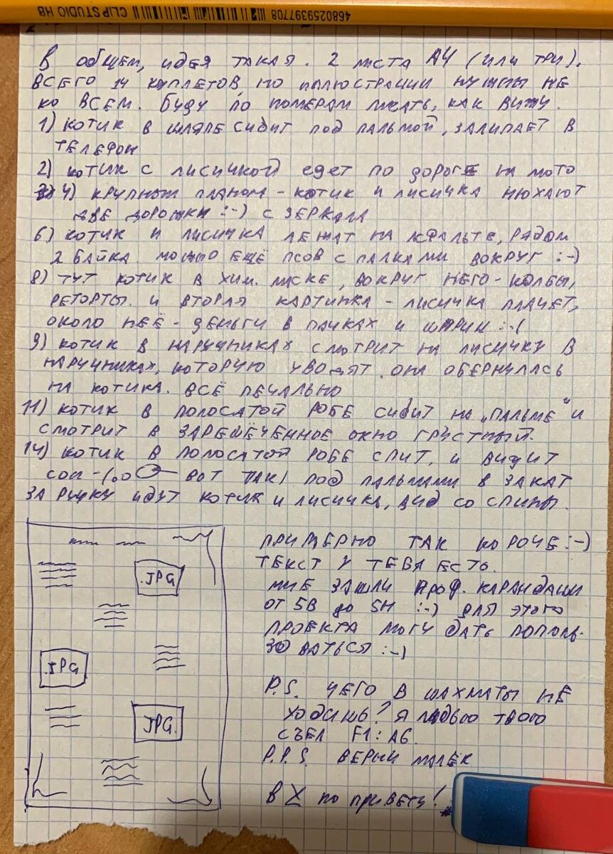 Привет! Во избежания многих вопросов и недопонимания, а также: о чем этот блог, кто мы такие (Арестант и Лисичка), навигация по каналу ЗДЕСЬ. Мы обращаем внимание, что любая информация в блоге носит повествовательный характер, и ни в коем случае НЕ пропагандирует нездоровый образ жизни, а наоборот - имеет цель предупредить читателей о проблемах с зависимостями и законом. Читать рукопись с фото не нужно - текст напечатан ниже. (Примечание: это - ТЗ к балладе Арестанта "Пальмы", которая опубликована ЗДЕСЬ) В общем, идея такая. 2 листа А4 или 3. Всего 14 куплетов, но иллюстрации нужны не ко всем. Буду по номерам писать, как я это вижу: Котик в шляпе сидит под пальмой, залипает в телефон; Котик с лисичкой едет по дороге на мото; Крупным планом - котик и лисичка нюхают две дорожки :-) с зеркала; Котик и лисичка лежат на асфальте, рядом 2 байка, можно еще псов с палками вокруг :-) Котик в химической маске, вокруг него колбы, реторты. И вторая картинка - лисичка плачет, около нее пачки дене