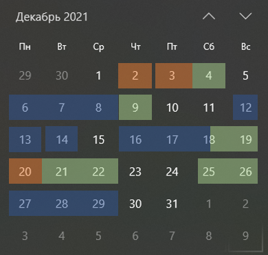 Вчера звонит коллега с вопросами по делам всяким и разговор начинается с вопроса: Ты вообще где? А я в поезде ехал, как раз из Москвы домой, над чем и посмеялись, что где я не очень понятно, но главное, чтобы было понятно откуда, зачем и куда я двигаюсь. А сейчас надо было вставить в график декабря еще один деловой день в Москве, которого до вчерашнего дня не было. И это была задачка не из простых. Вот примерно так теперь выглядит месячная загрузка по декабрю и тут высветил зеленым так называемые Bleisure-дни, это когда я в поездке приделываю дни, когда я не занимаюсь глубоко делами, а нахожусь в режиме ответов на чатики. И их получается, в общем-то не мало. Это к тому, что я не только мотаюсь как умалишенный между городами. Ну, то есть да, но я осознанно вставляю лайтовые дни и заставляю себя в эти дни чилить. Причем это не история про то, что я остаюсь где-то поработать, это именно дни переключки от дел, между делами и перед разными проектами. Рыжие - это дни преподавания. Когд