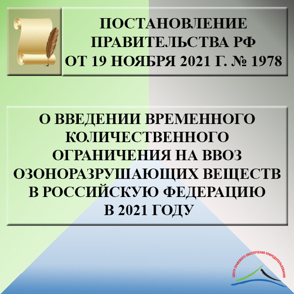 Постановление Правительства Российской Федерации от 19 ноября 2021 г. № 1978 «О введении временного количественного ограничения на ввоз озоноразрушающих веществ в Российскую Федерацию в 2021 году» Постановлением Правительства устанавливается количественное ограничение на ввоз в Российскую Федерацию озоноразрушающих веществ, указанных в группе I списка C раздела 2.1 перечня товаров в отношении которых установлен разрешительный порядок ввоза на таможенную территорию Евразийского экономического союза (далее – ЕАЭС) и (или) вывоза с территории ЕАЭС, предусмотренного приложением № 2 к решению Коллегии ЕАЭС от 21 апреля 2015 г. № 30 «О мерах нетарифного регулирования». Согласно данному Постановлению, озоноразрушающие вещества из группа I списка C не допускаются для ввоза в Российскую Федерацию в 2021 году. Дата опубликования: 23 ноября 2021 г.